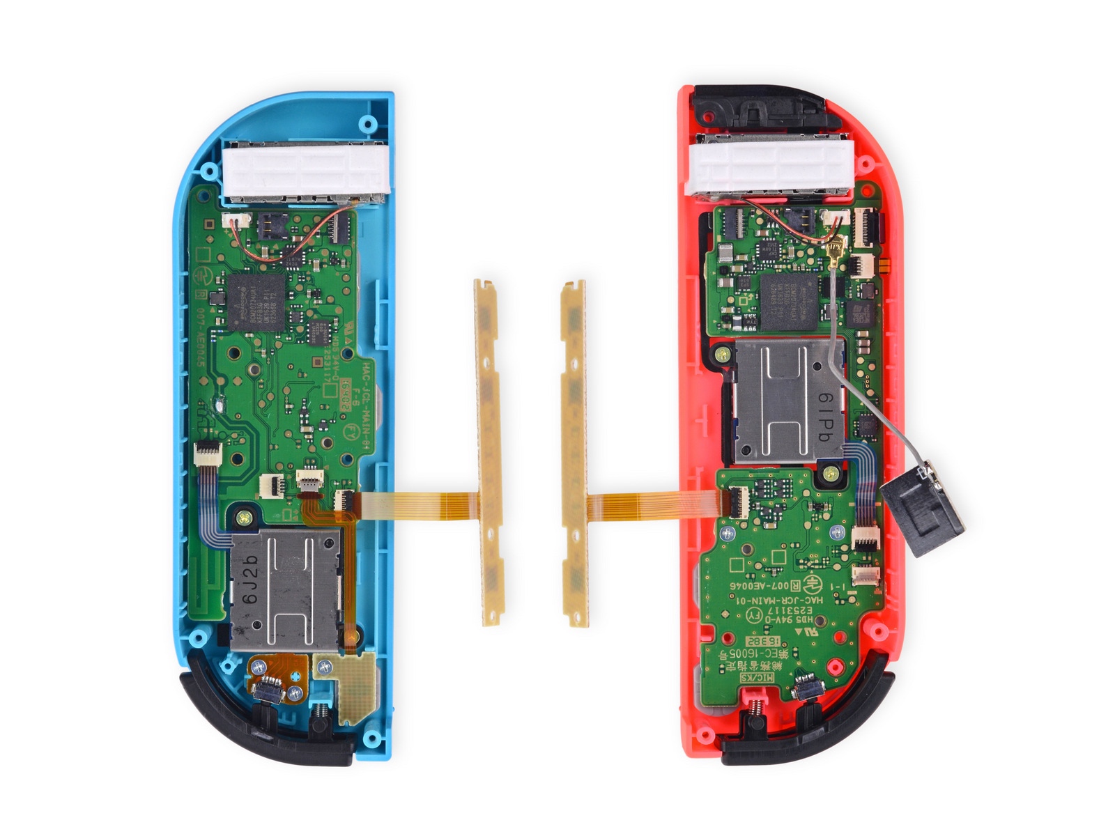 But why is the left Joy-Con problematic and not the right one? Both Joy-Cons use the same Broadcom Bluetooth transceiver. But if you look at a Nintendo Switch teardown, you can see that the controllers aren’t exactly the same. Here’s iFixit’s photo: