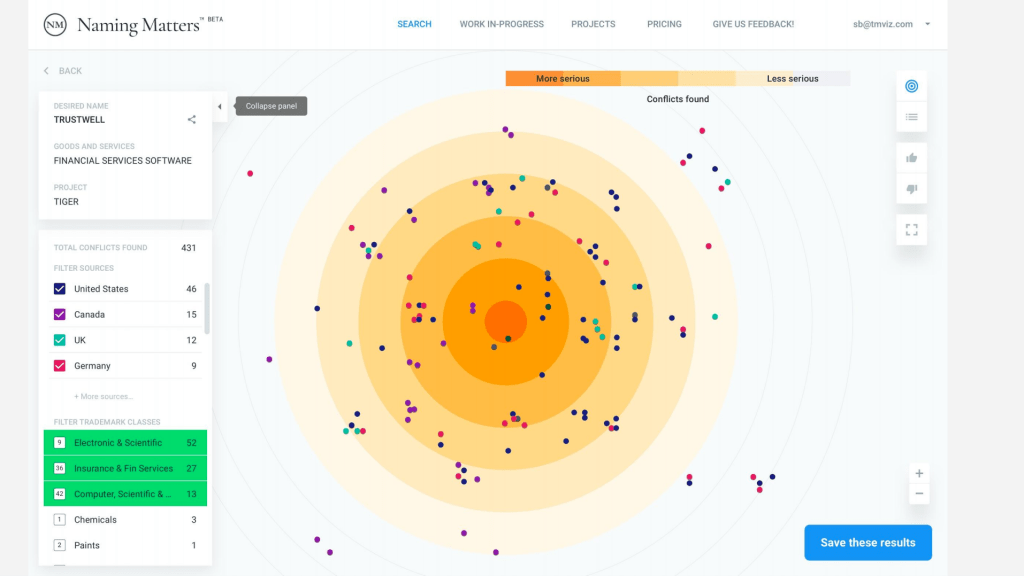 SM: There are so many engineers and creative people who have no knowledge of trademarks or how they should work, and by merely looking at the visualization (that we produce for users), where the bigger the dot is to the name you’ve chosen, or the more crowded, the more [risky] the brand — it just offers incredible cost and time savings by being able to visualize this data.