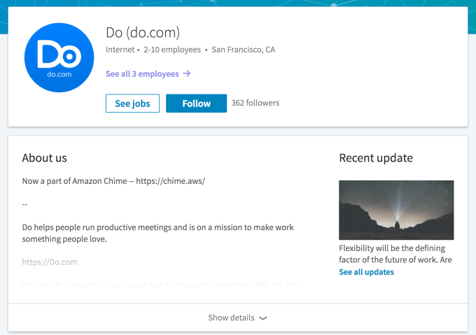 On February 15 (two days after Chime launched), Do announced it had been acquired and would close its service — including its web, mobile and Apple Watch apps — at the end of the month. Do didn’t name a buyer, but a reader tipped us off to the company’s profile on LinkedIn, which notes that the startup is “now a part of Amazon Chime.” Other Do staff also note the acquisition on their profiles.