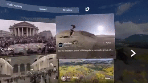 At launch, Facebook 360 will feature four main “feeds,” delivering content into users’ eyeballs from closer than ever. The “Explore” tab will give users a bird’s-eye look at the 360 content that is popular across Facebook from a variety of media companies and creators; meanwhile, the “Following” tab will let you dial into the content being produced by your friends. “Saved” gives you an opportunity to experience 360 content you may have seen on the web in a more immersive in-headset experience, while “Timeline” lets you check out your own 360 photos and videos all in one place.