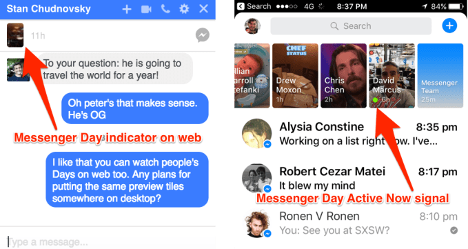 While there’s no Like counter, Messenger lets you instantly reply privately to a Day with custom or pre-filled messages like “haha”, “Wow”, a heart, or a “100” emoji that show in your chat thread with that person. This drops the barrier for turning a broadcast into a conversation that can feel a bit daunting in Snapchat. And if you’re already chatting with someone who’s posted, you’ll see a call out on mobile and Facebook’s desktop site to watch their Day.