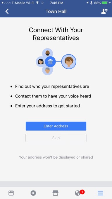 To use Town Hall, you only have to enter your address — which Facebook says is not displayed or shared (though it doesn’t say it’s not “saved,” so be advised). We understand this information will be used to power future civic engagement products, like finding a polling place or previewing a ballot.