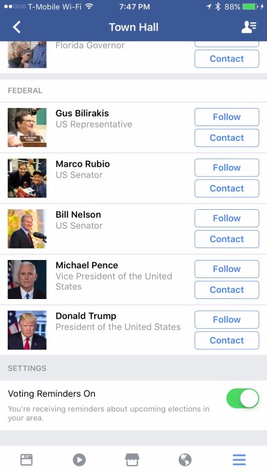 Town Hall is hardly Facebook’s first foray into politics. The social network has regularly prompted users to register and vote through a number of means, including push notifications, banners in its News Feed, Messenger integrations, maps to polls, social sharing features (like “I voted”) and more — including, in this past presidential election, an “Election 2016” shortcut in users’ Favorites section on both web and mobile. It also published a voter guide, which included down-ballot propositions and local races.