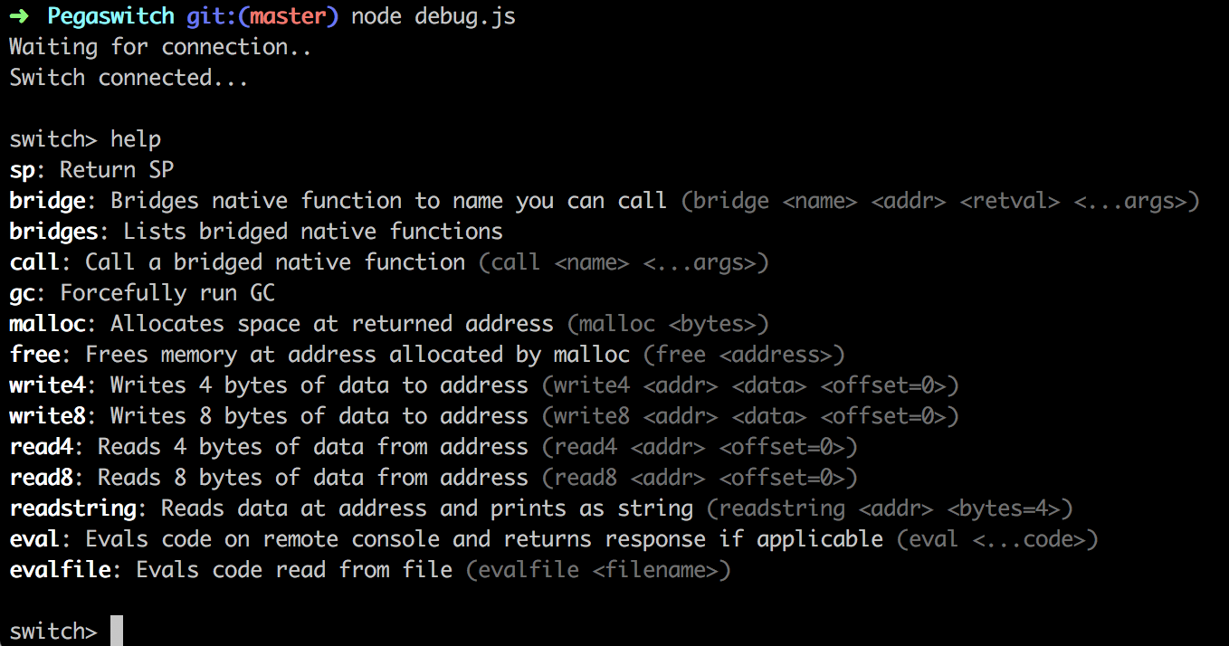 To try the exploit you must run the program on your machine and set the DNS server for the Switch to your machine’s IP address. When the Switch tries to connect to Wi-Fi it will go to the home-brew captive portal on your machine and then you can read and write directly to memory from a very simple shell. Imagine, if you will, that this is a blind probe poking at the Switch’s brain versus the traditional jailbreak where the code is “thinking” it’s running a real, signed program.