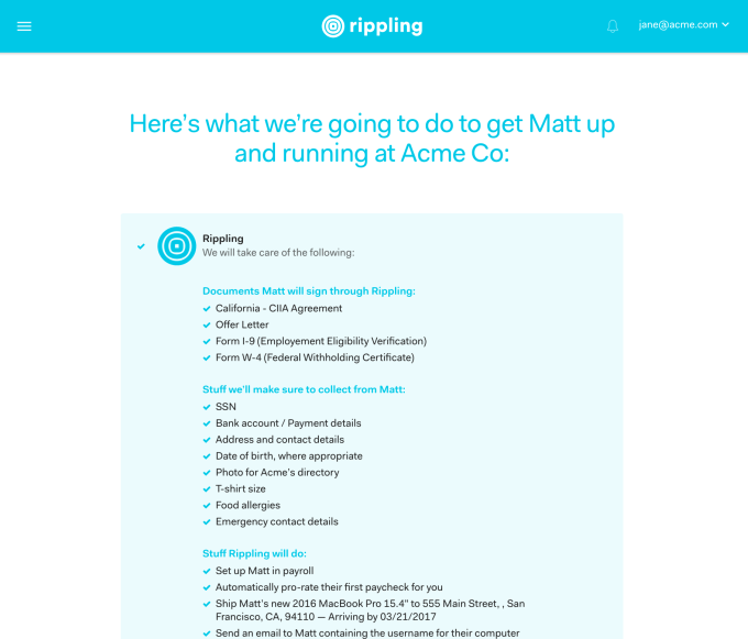 Conrad’s new company is called Rippling, which is launching today. The goal is to turn the process of bringing on an employee and assigning them hardware and the services they’ll need to operate — like Gmail or Salesforce — right away. Rippling integrates with a bunch of major services on the back-end and automatically assigns those accounts to new employees, and also helps managers set up payroll in several states.