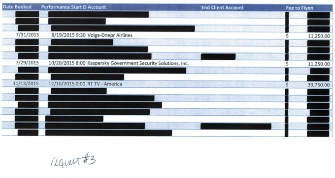 One invoice form dating back to 2015 shows payments to Flynn made by three Russian entities: $33,750 from state-sponsored news source RT TV, $11,250 from Volga-Dnepr Airlines and $11,250 from Kaspersky Government Security Solutions, Inc.