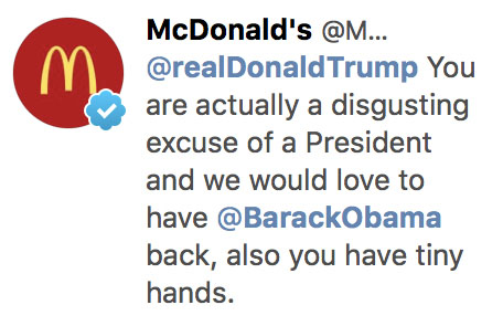 McDonald’s has since deleted a tweet reading, “@realDonaldTrump You are actually a disgusting excuse of a President and we would love to have @BarackObama back, also you have tiny hands,” and the apology/excuse/damage control is no doubt forthcoming. But while it was up, the fast food chain (or whoever had access to its social accounts) even went so far as pinning the bold proclamation to the top of its page for good measure.