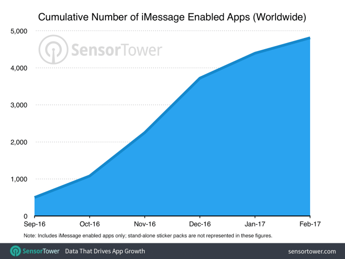 According to a new report from app intelligence firm Sensor Tower, there are nearly 5,000 Message-enabled apps – the same number of iOS apps released in year one of the App Store. That should be a promising figure, given how much the iOS App Store has grown over time – it has 2.2 million apps as of January, 2017, Apple said.