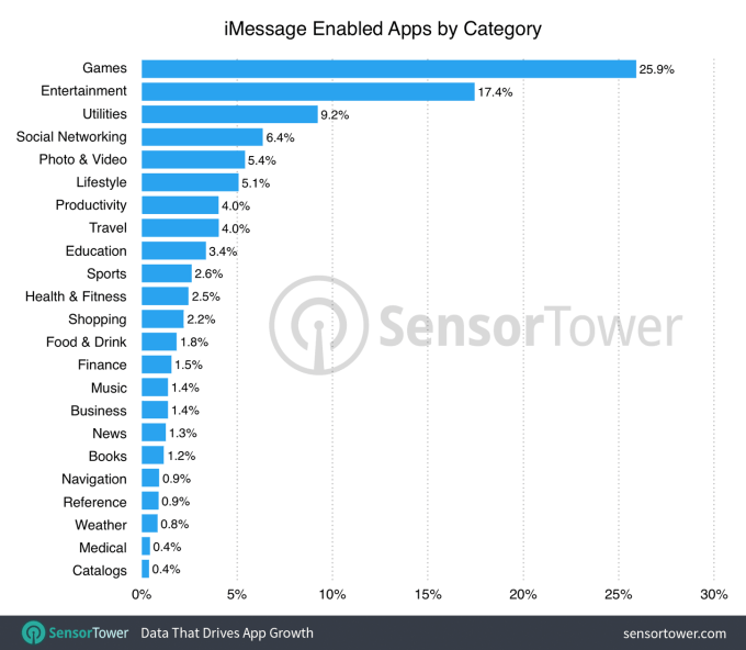 Games continue to be the most popular iMessage app category, ahead of entertainment, utilities, social networking, and photo & video apps. However, even within these categories, many of the apps are stickers – like those that use the existing IP from a popular gaming franchise, for example.