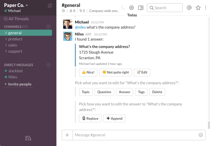 Niles, a company in Y Combinator’s Winter 2017 batch, wants to be your company’s chat assistant — an alternative to that internal wiki that every company has and no one uses. It sits in Slack and tries to learn the answers to the questions that your team is tired of hearing for the billionth time.