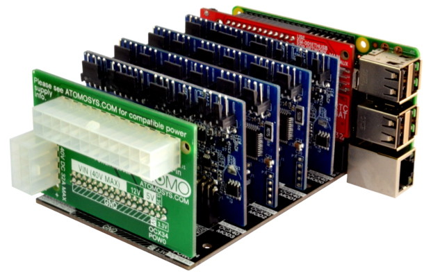 There are a number modules, including I/O boards, network expansion boards and even power supplies for bigger projects. For example, the project below has four I/O adapters and a power supply all connected to a Raspberry Pi. This means you can do some really interesting things with robotics and even hydroponics with the package the size of a hunk of cheese.