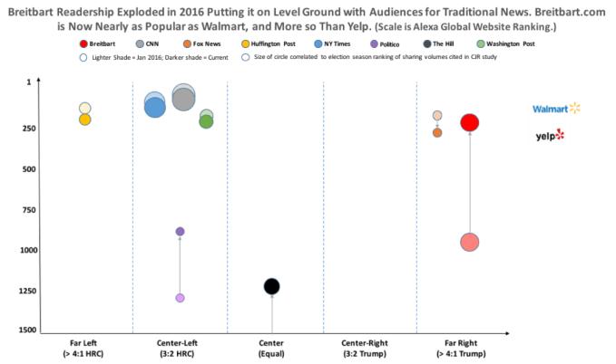 One of the most interesting discoveries in their data is the finding that in 2016, Breitbart.com (a hyper-conservative website previously run by current White House Chief Strategist Steve Bannon) had effectively displaced Foxnews.com as the center of gravity for where most on the right side of the political spectrum consumed political information online. Breitbart — which Bannon described during an interview last summer as the “platform for the alt-right” — is beloved by its readers for producing headlines such as “Gabby Giffords: The Gun Control Movement’s Human Shield.”