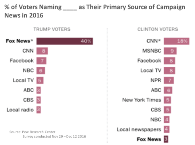 But reliance on a single source for information, while increasingly pushing away other sources, can in turn disproportionately affect voting patterns. In 2016, for instance, 40 percent of all voters for President Trump reported that Fox News had been their primary source of news for the 2016 campaign.