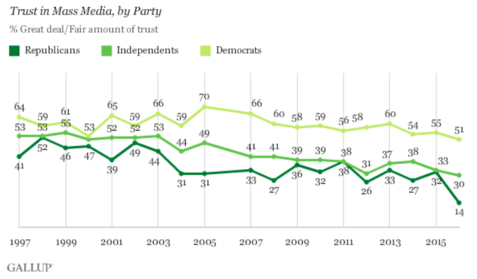 To quantify things, a September 2016 study released by Gallup showed that only 32 percent of Americans said they trusted the media. This was down from 40 percent a year earlier and 50 percent in 2005. In the late 1990s and early 2000s that figure generally hovered in the low-to-mid- 50s. But is it really all Americans that increasingly distrust the media? Well, not exactly. Gallup further broke the figures down by political party, revealing some telling results.