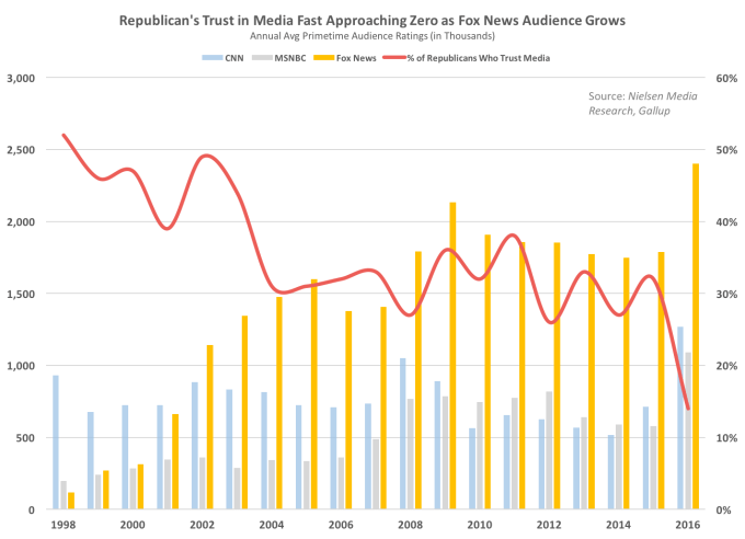 And much like conservative talk radio’s explosion onto the scene, declining trust in traditional media and Fox News ratings growth have seen a co-dependent relationship.