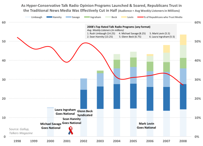 In just a short 15 years — and with only 14 percent of Republicans left still holding out — the collective effort of conservative right-wing radio personalities paired with a soaring Fox News, and now Breitbart, has managed to convince much of an entire major political party to trust only them.