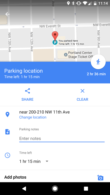 In addition, Google’s parking location saver will let you enter in how much time you have left at the spot. This is handy if you’re in a temporary parking area (e.g. “two-hour parking”), or at a metered space. The time left is displayed on the map, and when it’s due to expire, Google Maps will alert you via push notification.