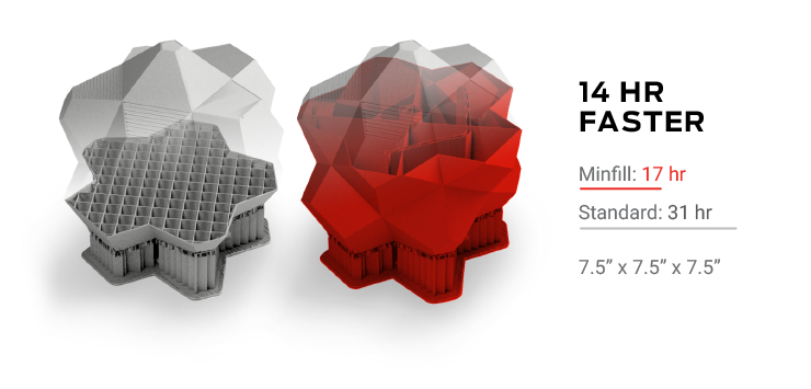 MinFill, which is a simple setting the user checks before starting a print, changes the process of one from simple repeating lattice or crosshatch structures to unique designs customized to the specific print. “Depending on the geometry,” says the company’s source material, “it builds the smallest possible support structure required inside the object, such as columns that begin narrow and branch out into areas that need support and extremely low density infill to anchor and support those columns.”