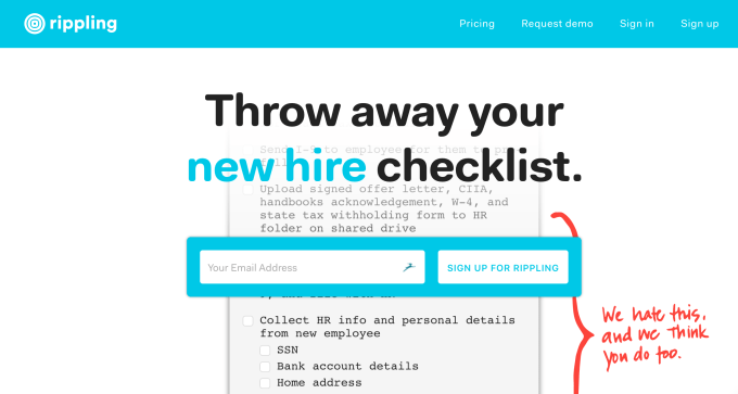 Whenever a new employee is hired, a company has a list of 100 to 200 things you need to do to get them up and running. Now HR departments only need to click hire and Rippling will do everything else. From setting up employees with payroll to getting them their company-issued laptop to getting them signed up for email, Slack and all the other cloud services a business might use, Rippling takes care of it.