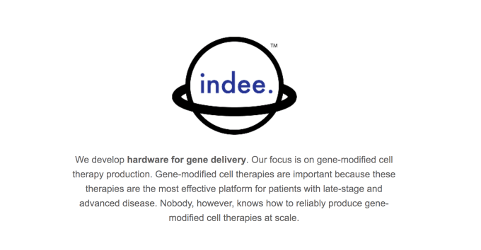 Indee provides a new way to use CRISPR to edit the genome of cells. Current methods of editing genes include using viruses or electroporation, but Indee uses microturbulence to dissolve molecules within a cell. It currently is targeting a $1.5 billion addressable market for immunotherapy, but sees that market growing to $9 billion as the market improves.