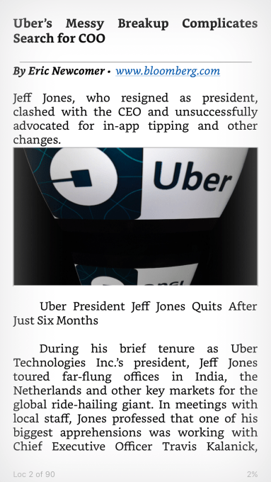 When you launch the Kindle app, the article will be saved at the top of your Library, ready for your reading. It will also appear on the Kindle app on any platform, not just iOS, and on Kindle hardware devices themselves — just like any e-book download would.
