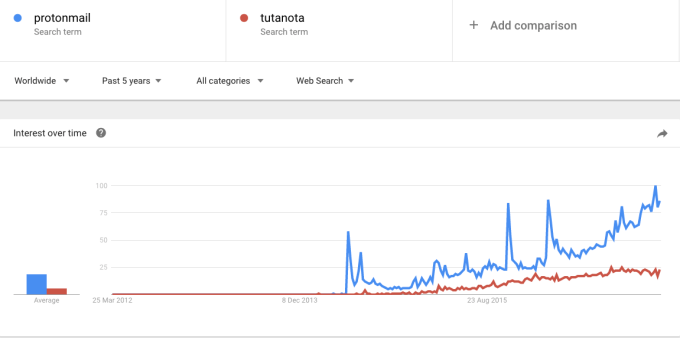 A Google Trends search comparing ‘protonmail’ and ‘tutanota’ shows interest in both search terms rising, with ProtonMail’s growth curve especially pronounced.