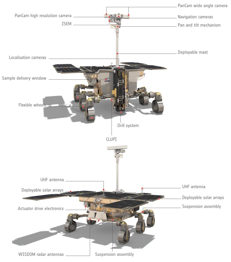 The mast is topped with the big PanCam for visible-light images in 2D and 3D. This will be sending back all the cool pics you’ll send to friends, if any of us survive until this thing lands in 2021.