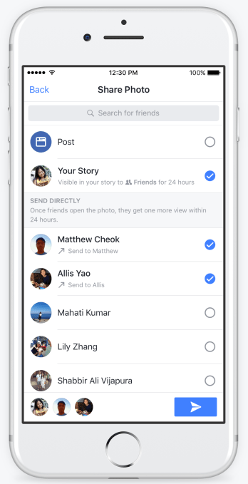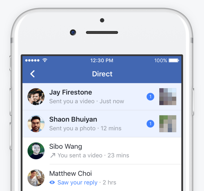 While Facebook split off chat from its main app a few years ago and forced people to download Messenger, Direct brings private communication back to the main app. Anything you shoot or upload through Facebook Camera can be sent to specific friends who’ll receive it in their Facebook app’s Direct inbox. You just can’t start with a text. These messages last at least until they’re viewed, and will remain visible until the conversation stops. So if you’re rapidly replying back and forth with text or images about a Direct message it will stay alive, but it goes away once you cease to banter.