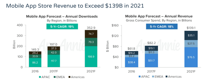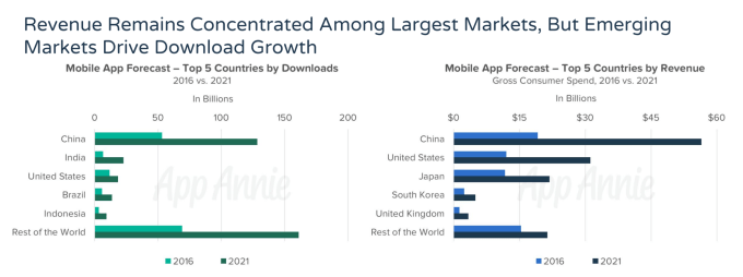 Downloads in China will grow at an annualized rate of 19 percent from 2016 to 2021, while consumer spend will grow 24 percent to $56.5 billion. In larger cities, much of the smartphone market in China is already saturated, meaning a lot of growth will come from other regions across the country.