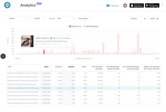 Periscope’s analytics dashboard will track video duration, number of viewers, hearts and time watched per viewer. Hopefully they can expand into providing data on a minute-per-minute basis tied to your stream’s replay so you can start to learn exactly where you’re losing people, but this is a solid start.