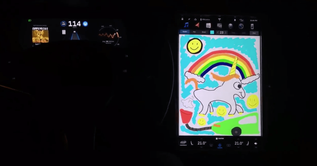 Above, you can see Twitter user and Canadian Tesla owner Nik Jovanovic using the new Easter Egg virtual easel in his car. The choice of subject is excellent, depicting the true power source of the Tesla Model S, and it clearly impressed Elon Musk: The Tesla CEO tweeted this image, along with a rudimentary Mona Lisa, when he revealed the nature of the new Easter Egg himself.