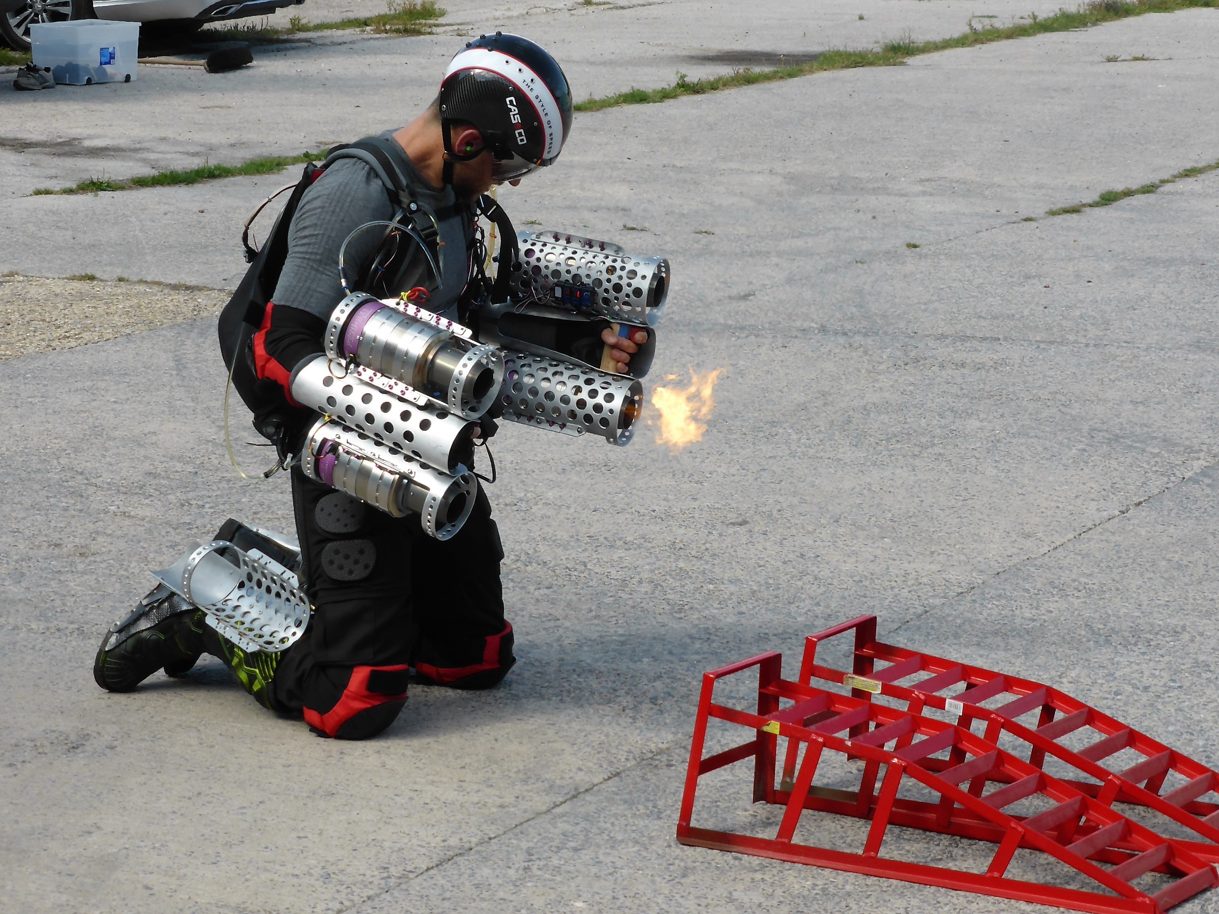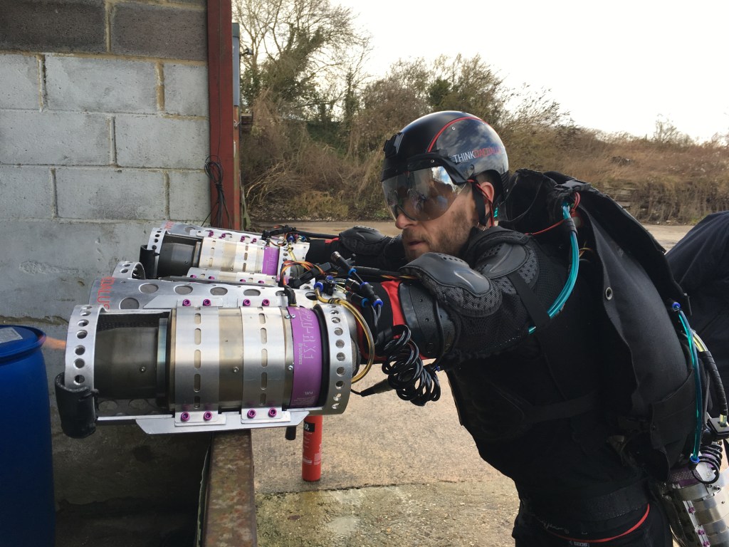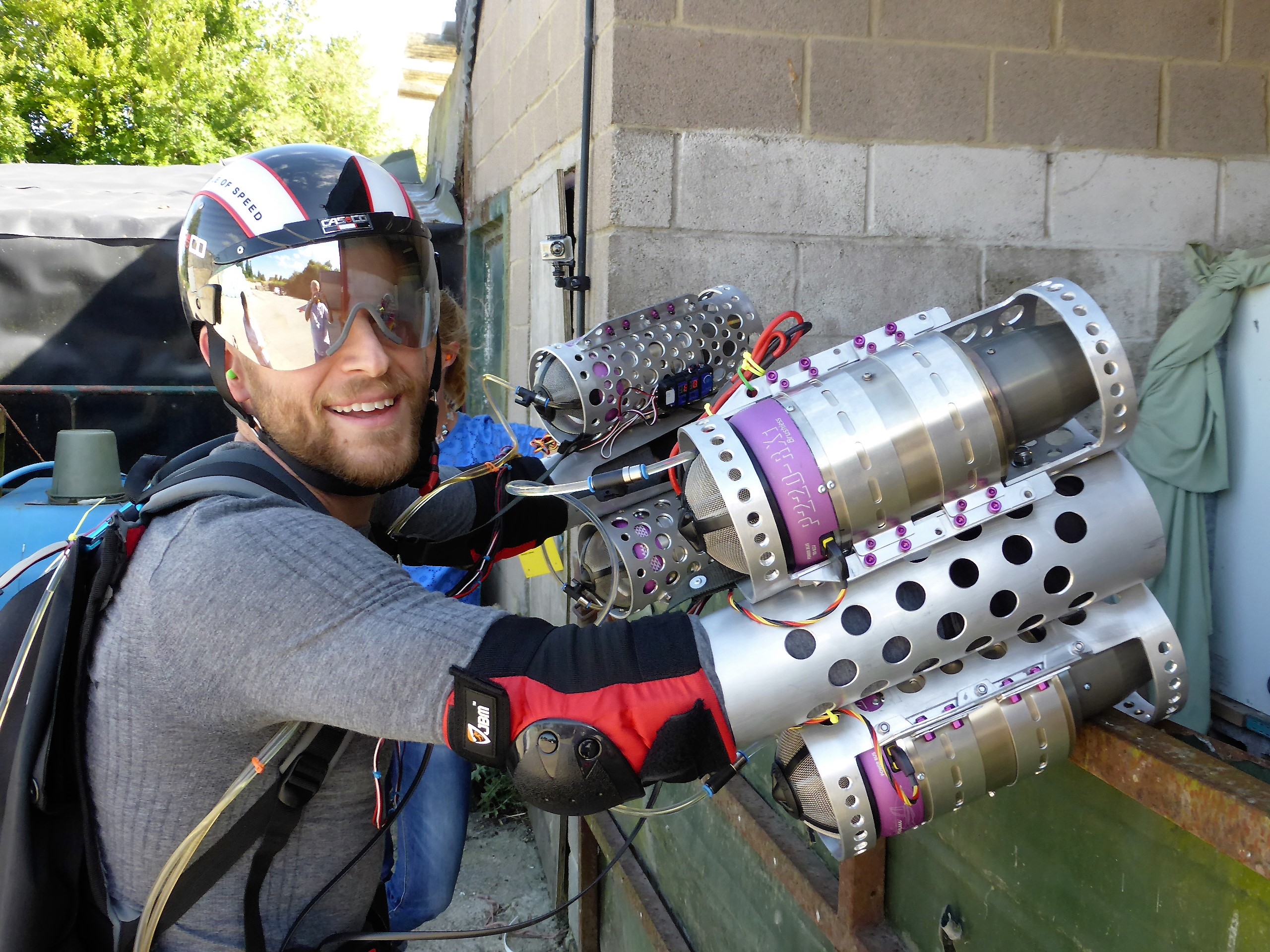 “We pivoted the idea,” he explains. “We stuck with the idea of the human mind and body as being the core of it, but added in a little bit of horsepower. We played around with electric drone fans, but the power to weight ratio isn’t there, so we went to gas turbines.”