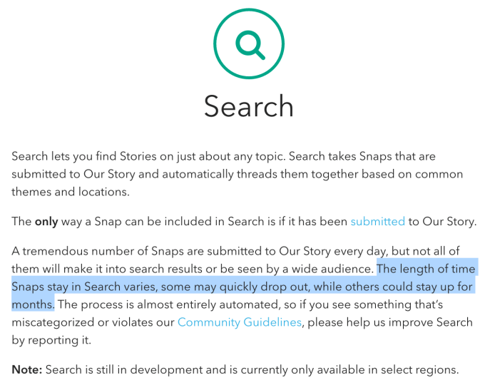 It also sees Snapchat break one of its cardinal rules. User-generated content is no longer limited to a lifespan of 24 hours. A Snapchat spokesperson confirms to TechCrunch that some Snaps submitted to Our Stories that appear in the new Search feature will be visible for less than a day to up to a few weeks or even months.