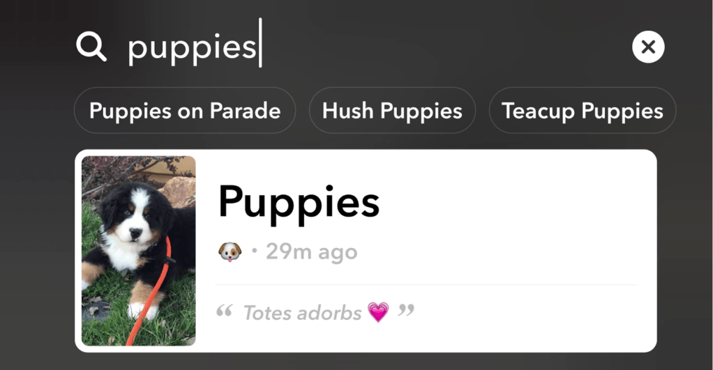 Now, Snapchat is using algorithms to scan the caption text, time and visual elements found in Snaps submitted to Our Story and group them by theme. For example, it could pull out Snaps with the words “dog” or “puppy” in captions, or use machine vision to detect the shape of a real dog in the photos or videos, and aggregate them into an Our Story that comes up when people search for “Puppies.” Snap notes you could use this to watch a nearby basketball game, see what’s happening at a local bar, check out a specific Fashion Week runway show or explore a vacation spot. More than 1 million themes will have Search results available.