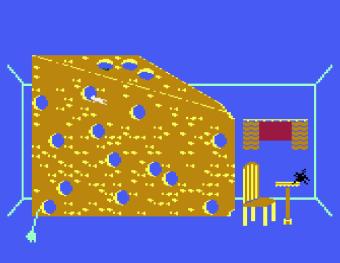 At any rate, as Freddy the Cat, you must navigate five different rooms, each of which serves as a discrete minigame. One room contains a fishbowl on a table; you must jump in, swim around, and catch the fish without touching any of the electric eels. Another room contains a birdcage you have to knock off the table so you can free and catch the bird it contains.