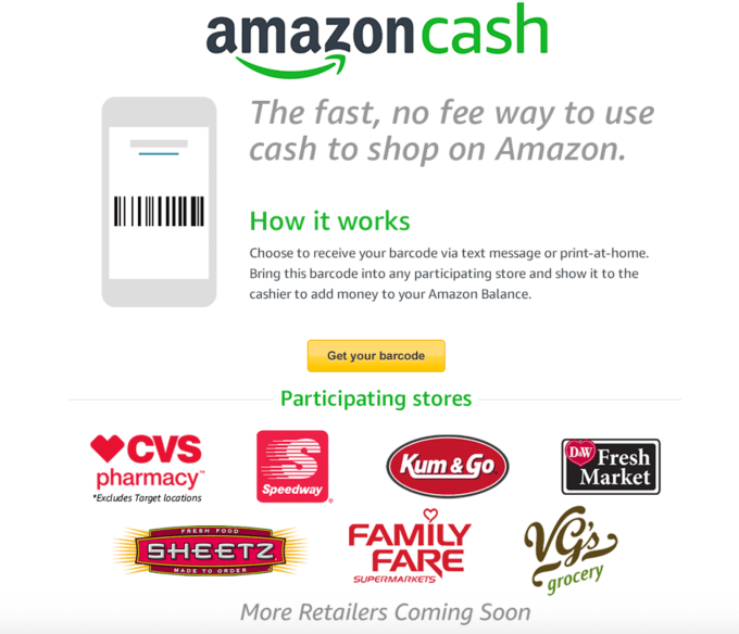 Amazon Cash will be available at brick-and-mortar retailers across the U.S., including CVS Pharmacy, Speedway, Sheetz, Kum & Go, D&W Fresh Market, Family Fare Supermarkets, and VG’s Grocery. Other stores will be added in the future.