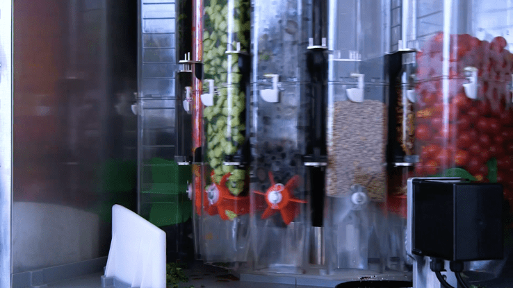 Chopped, whole and liquid ingredients are stored in individual tubes, and the system knows which is in each, whether it’s a dressing, vegetable, cheese or other toppings. The tubes are filled at least once a day by people. The system sends alerts to customers when any ingredient is running low and needs a refill.