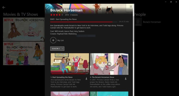 Downloading content is not difficult — in the updated app, you just tap the down arrow next to the show, movie or episode you want to watch to save it to your Windows 10 device. You also can browse for things that can be downloaded through the new section in the app, “Available for Download,” via the menu. Here, another tab called “My Downloads” will let you manage that content.