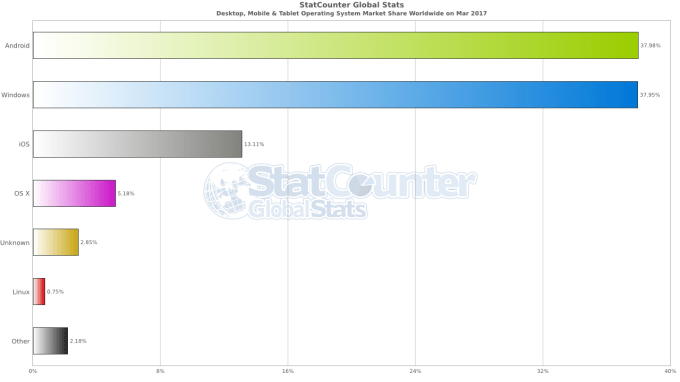Research from web analytics company StatCounter found Android now accounts for a larger share of internet usage than Windows for the first time. During March 2017, Android users represented 37.93 percent of activity on StatCounter’s network versus 37.91 percent for the Microsoft operating system. It’s a small gap for sure — and it refers to usage not necessarily users — but it marks a notable tipping point that has been inevitable for the past couple of years.