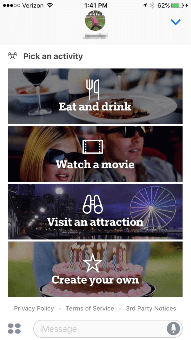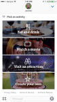 When you first launch the app, it asks you to select an activity: “Eat and drink,” “Watch a movie,” “Visit an attraction,” or “Create your own.”