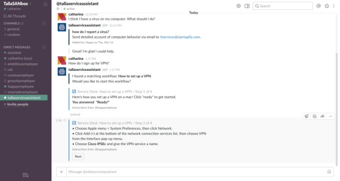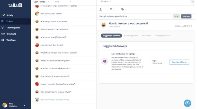 The company wants to be more than a conversational bot, however. It wants to be a central place for processing IT and HR requests. That means having a ticket system, a knowledge base and the ability to broadcast to employees, for example, when the system is going down for maintenance or the office is closed for a holiday.