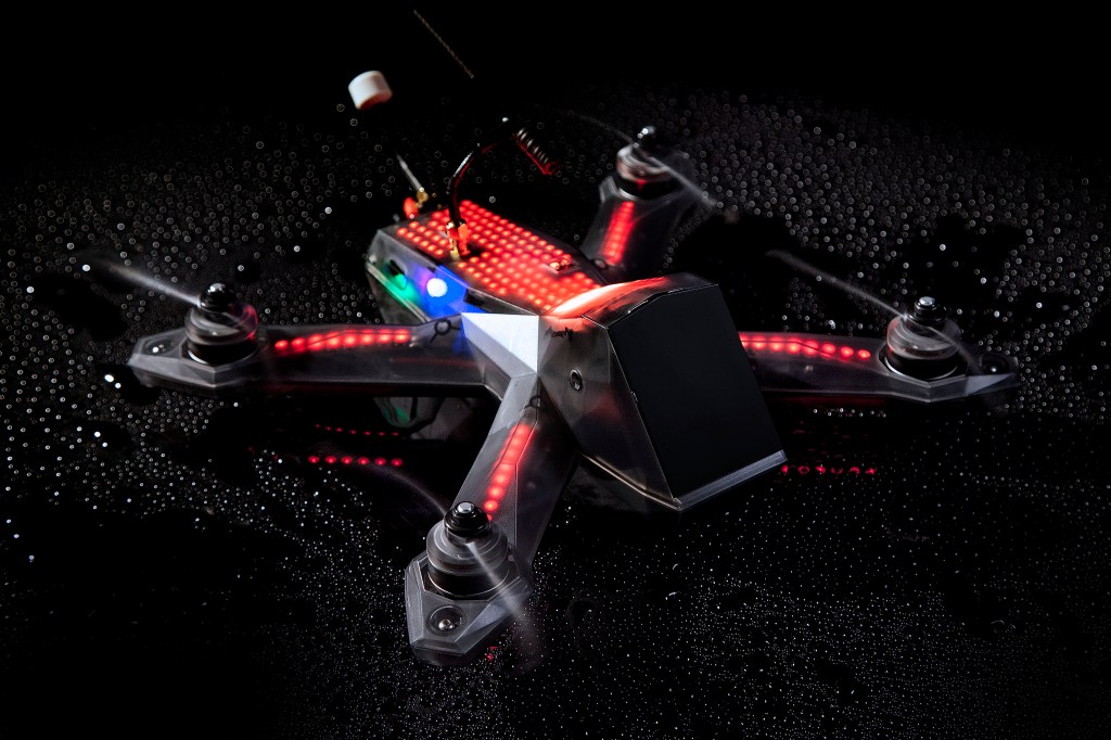 The drone, called the Racer3, has a top speed of 85 MPH, and can go from 0-80 MPH in under one second. They also have 210 LED lights for pilot identification and visibility to the audience.