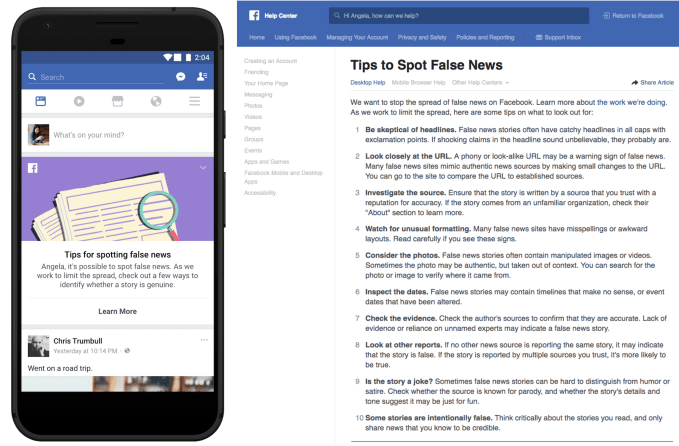 That’s why it’s also tried to take matters into its own hands with product changes and other projects, like working with outside fact checkers to label disputed news stories with warnings in the News Feed. It’s also provided a special option for flagging false news stories, down-ranked suspicious stories, began detecting and blocking false news spammers, denied false news publishers the ability to buy Facebook ads and funded the $14 million News Integrity Initiative.