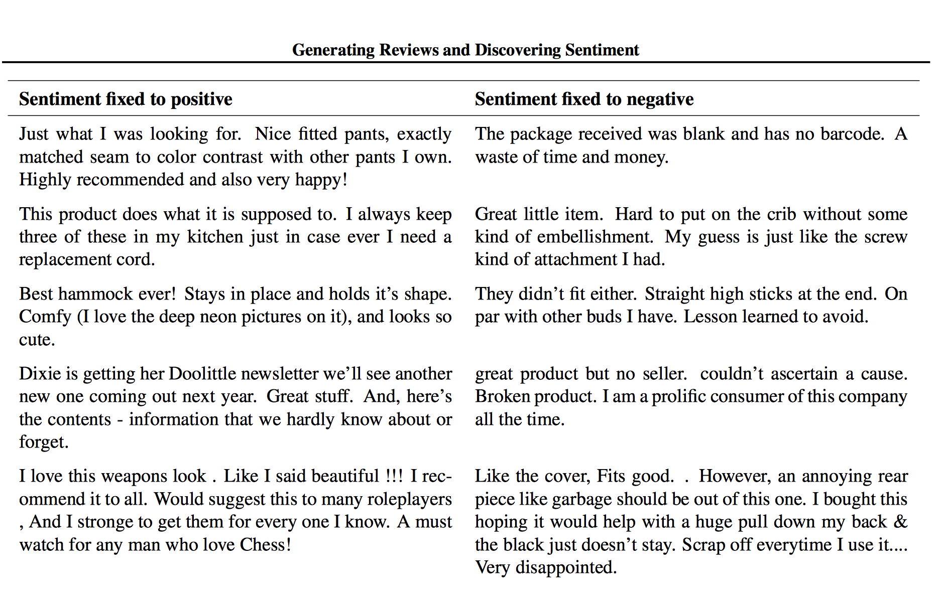 Because the model was trained to be generative, it was also able to output reviews with preset sentiments. The table below is pulled from the paper and shows a random assortment of examples for both positive and negative reviews.