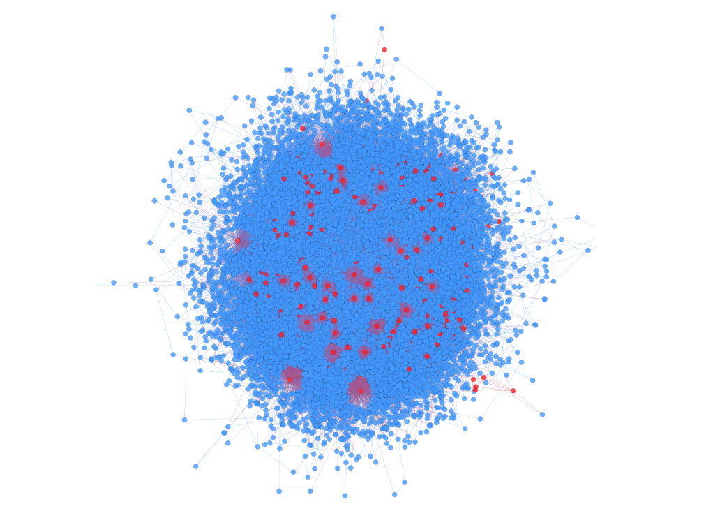 In the illustration at top you see a visualization of the comments at AV Club; blue dots are users and red ones are sockpuppets, which tend to cluster together because of their more frequent interactions. They’re also more central because of their greater activity than ordinary users.