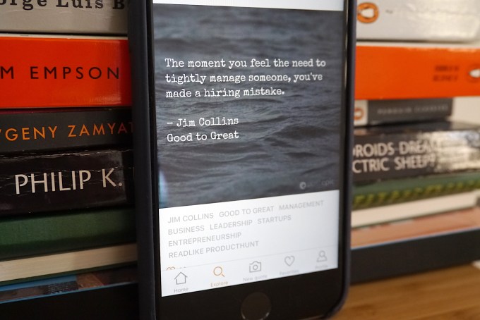 It’s certainly still a fairly unformed thing at this stage, especially given the size and nature of its early adopter community — having only clocked a few thousand downloads for its MVP v1 via a launch on Product Hunt. So even though the team has curated a bunch of quotations themselves to populate the app, you’re more likely to find quotes about scaling a startup than lines from a Shakespearean sonnet. But the core function of v2 has been executed well, within a clear app structure. So it’s super simple to capture, edit and share nicely presented quotes.