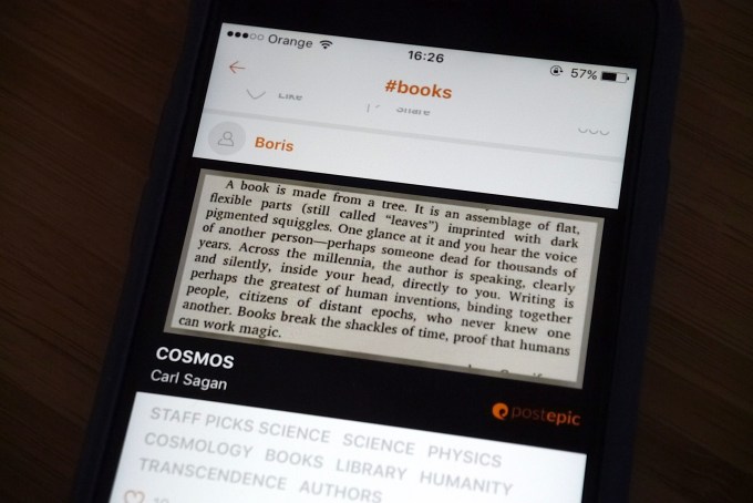 Postepic is not the first app to take a shot at wordy snippets, though. Others have tried to build an ‘Instagram for book quotes’ — Quotle, for example — but no one has yet managed to generate significant momentum for the concept. It might be because sharing book snippets is inherently more niche than sharing photos (it’s certainly more bounded, given language barriers). Or because no one has made a slick enough version to attract more mainstream appeal.