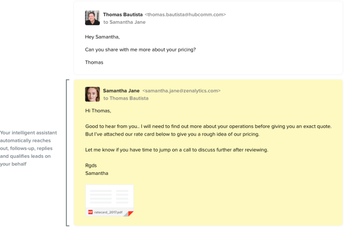 It isn’t a full on sales team replacement at this point, rather it is focused on handling inbound leads or reigniting stale prospects. The AIs can use charts, figures and PDFs and when a lead becomes warm again they can hand it over to a designated employee to take things further.