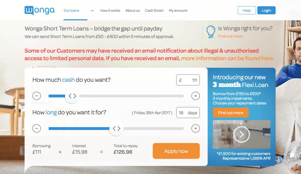 A notification on Wonga’s U.K. website currently warns of “illegal and unauthorised access to limited personal data,” and says affected customers have been emailed about the breach.