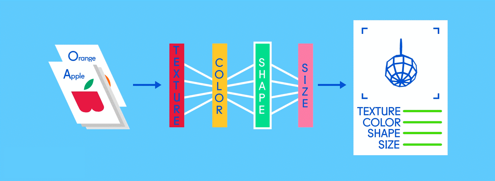 Let’s say this labeled data consists of pictures of apples and oranges, respectively. The pictures are the data; “apple” and “orange” are the labels, depending on the picture. As pictures are fed in, the network breaks them down into their most basic components, i.e. edges, textures and shapes. As the picture propagates through the network, these basic components are combined to form more abstract concepts, i.e. curves and different colors which, when combined further, start to look like a stem, an entire orange, or both green and red apples.